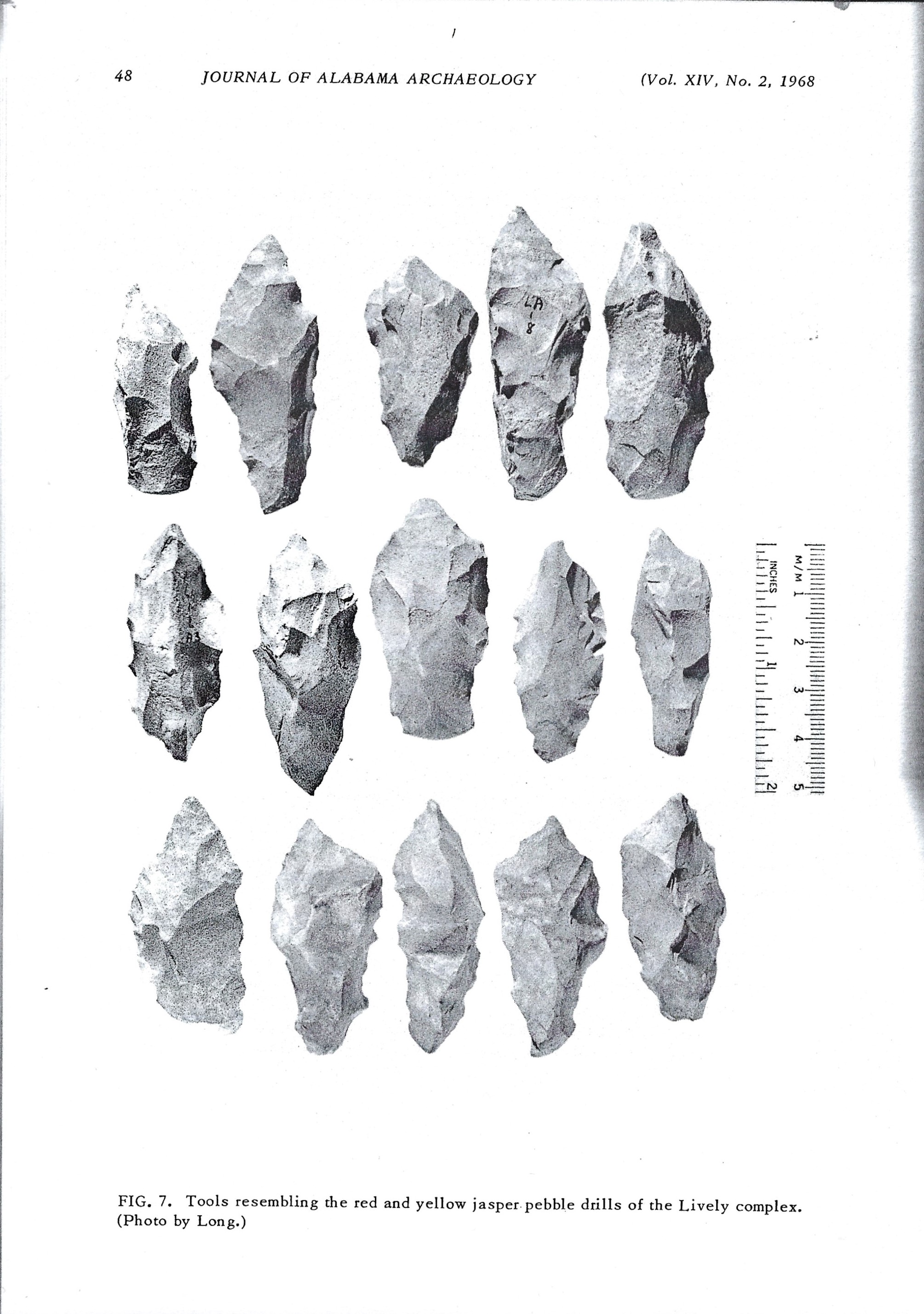 The article by Dad and Bart appeared in the December 1968 issue of the Journal of Alabama Archaeology published by the Alabama Archaeological Society. I have reproduced most pages of the article here. They note that little had previously been written about Native American sandstone quarries. The discs resulting from this work may have been used for ceremonial purposes or shallow bowls. Cutting or drilling tools of jasper similar to those found at another site were in abundance at this one.